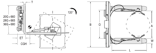 | Capacity 承載能力(kg) | Catalog Order NO 型號(hào) | Mounting Class 安裝等級(jí) | Capacity Load Center on forks承載能力@貨叉載荷中心(kg@mm) | Frame Width 框架寬度B(mm) | Opening Range張臂范圍A(mm) | Fork Size貨叉尺寸LxWxT(mm) | Minimum Truck Carriage Width叉車貨叉架寬度最小值O(mm) | Weight 自重(kg) | Effective 失載距ET(mm) | Horizontal Center of Gravity 水平重心CGH(mm) |