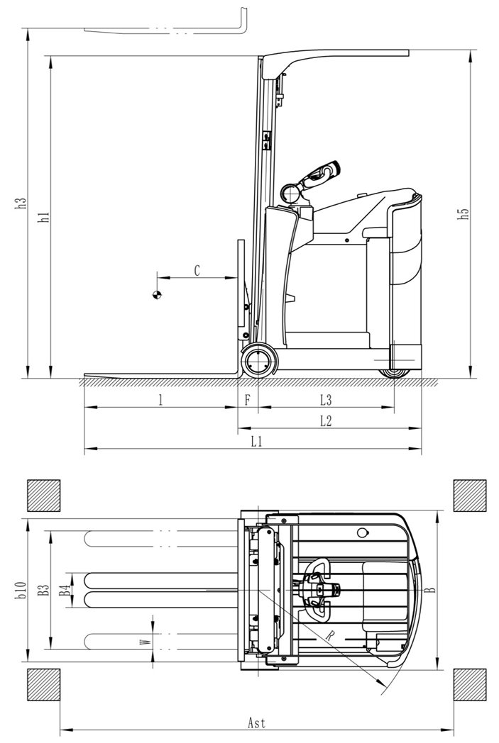 | 直角堆垛通道寬度 | 1000×1000托盤 | Ast | mm | 2340 | 2800 | 2800 | |